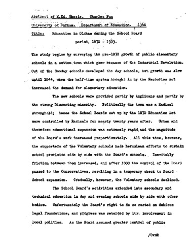 The study begins by surveying the pre-1870 growth of public elementary schools in a cotton town which grew because of the Industrial Revolution. Out of the Sunday schools developed the day schools, but growth was slow until 1844, when the half-time system brought in by the Factories Act increased the demand for elementary education. The new schools were provided partly by Anglicans and partly by the strong Dissenting minority. Politically the town was a Radical stronghold; hence the School Boards set up by the 1870 Education Act were controlled by Radicals for nearly twenty years after. Urban and therefore educational expansion was extremely rap and the magnitude of the Board's work increased proportionately. All this time, however, the supporters of the Voluntary schools made herculean efforts to sustain school provision side by side with the Board's schools. Inevitably friction between them increased, and after 1888 the control of the Board passed to the Conservatives, resulting in a temporary check to Board School expansion. Gradually, however, the Voluntary schools declined. The School Board's activities extended into secondary and technical education in day and evening schools side by side with other bodies. Unfortunately the Board's right to do so rested on dubious legal foundations, and progress was retarded by its involvement in local politics. As the Board assumed greater control of public elementary education, friction increased between the central departments at Whitehall and South Kensington and the locally elected body. This was resolved by the 1902 Education Act, abolishing the School Boards; assisting the Voluntary Schools and setting up the local education authority responsible for elementary and secondary education. The School Board had been highly successful in the former, and handed over to the local education authority an excellent foundation on which to build.