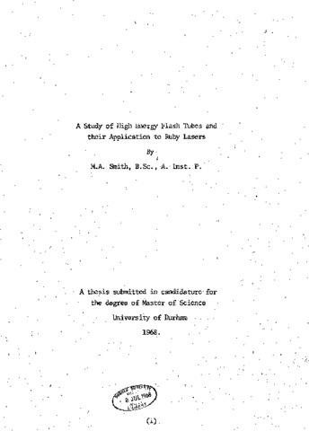 The design of 6½” arc length, xenon filled flash tubes capable of withstanding energy inputs up to 10000 joules is described. The lamp performance is investigated as a function of filling pressure, bore size of lamp between 10 mm and 15 mm, operating voltage, energy input and circuit parameters. The lamp life has been related to input energy, flash duration and the inner wall area of the lamp. Above a given lamp wall loading, the lamp is likely to shatter in the first few discharges. Lamp efficiency, measurements show that for a fixed capacitor bank, operating voltage variation between 1.0 and 2.4 kV does not change the efficiency and that the efficiency is lower when a lamp is lightly loaded. Flash duration is almost independent of bank voltage and tube bore. The peak light intensity is increased and the flash duration decreased by a factor 2 when the lamp series inductance is changed from 450 μH to100 μH. Design aspects of a laser system using ruby rods 6½” long x ½" diameter are studied and the output characteristics of six ruby rods of varying optical quality measured. The laser performance does not necessarily depend on the rod optical quality. Measurements of the variation of laser performance with lamp operating parameters show a linear relationship between output energy and input energy above laser threshold. For maximum efficiency, the lamp should be operated with a low bank capacity, a high bank voltage and short flash duration provided the lamp wall loading limit is not exceeded. The 10 mm bore lamp gives the highest efficiency. Measurement of the output beam divergence shows that the ruby rods giving the lowest beam divergence are of the best optical quality.