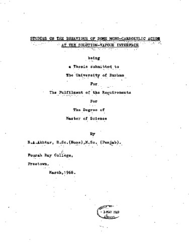 The behaviour of acetic, propionic and butyric acids at the solution-vapour interface at 30 has been studied systematically. The surface tensions and vapour-pressures of fourteen systems were measured and the Gibbs adsorption equation used to calculate surface excesses, ⌐ (_2) (^N), whilst the amounts of the individual components at the interface were calculated by well known methods. It is assumed that the thickness of the adsorbed phase is essentially monolayer in character. The orientation of the acids at the interface is assumed to be the ‘parallel’ one for adsorption from benzeno, carbon tetrachloride and cyclohexane and the 'perpendicular’ one for adsorption from ethyl alcohol and water. Two factors, - affinity between acid and solvent in the bulk and rate of lowering of surface tension of acid + solvent mixtures by the acids, have been need to account for the extent of acid adsorption at the interface. In general adsorption of acid increases with increasing chain length, although for the cyclohexane systems it decreases with increasing acid chain length. The occurrence of a mixed monolayer at the interface is observed for all the systems, and a uni-monolayer of acid is formed only from the pure component. For the water systems it is possible for the adsorbed layer to contain two water molecules along the length of the acid molecule due to the much smaller size of the water molecule. The present investigations have thrown further light on adsorption behaviour at the solution-vapour interface. A complete understanding of adsorption phenomenon at the interface, involving a reasonable assessment of thickness of the adsorbed layer, composition and orientations at the interface, etc., depends on the particular systems involved, on the properties of the solutions, and on the intermolecular interactions possible both in bulk solution and at the interface.