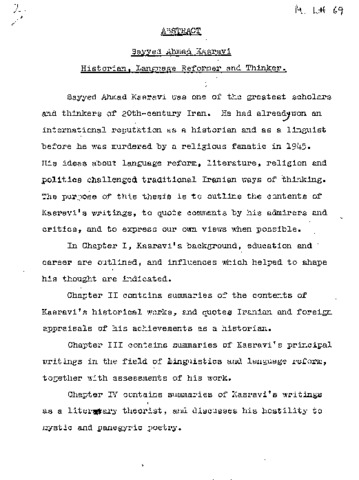 Sayyed Ahmad Kasravi was one of the greatest scholars and thinkers of 20th-century Iran. He had already won an international reputation as a historian and as a linguist before he was murdered by a religious fanatic in 1945. His ideas about language reform, literature, religion and politics challenged traditional Iranian ways of thinking. The purpose of this thesis is to outline the contents of Kasravi’s writings, to quote comments by his admirers and critics, and to express our own views when possible. In chapter I, Kasravi’s background, education and career are outlined, and influences which helped to shape his thought are indicated. Chapter II contains summaries of the contents of Kasravi’s historical works, and quotes Iranian and foreign appraisals of his achievements as a historian. Chapter III contains summaries of Kasravi’s principal writings in the field of linguistics and language reform, together with assessments of his work. Chapter IV contains summaries of Kasravi’s writings as a literary theorist, and discusses his hostility to mystic and panegyric poetry. Chapter V contains summaries of Kasravi's views on existing religions and of his own religious beliefs. Comments by his critics and some comments of our own are appended. Chapter VI contains summaries of Kasravi's views on mysticism, materialism and other ideological matters. Chapter VII contains summaries of Kasravi’s views on political, economic and social problems, with comments. In the Conclusion an attempt is made to assess the importance and influence of Kasravi’s life and work as a whole. Various Iranian and foreign views of Kasravi’s achievements are also quoted. In the three Appendices, further information is given on Kasravi’s life and personality and the sources of his ideas; and some comparisons are made between Kasravi’s ideas on religion, politics, and language, and other contemporary ideas.