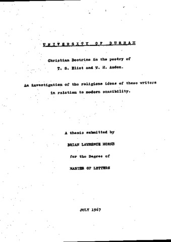 This thesis investigates the differing ways in which the Christian religion finds expression in the poetry of two modern, avowedly Christian, poets. The discussion centres upon the ways in which the two cardinal Christian doctrines – Incarnation and Atonement – are apprehended, and examines the distinctive relation each poet bears to the religious sensibility of the twentieth century. Auden’s understanding of the Christian vision of life and his grasp on the essential connection between the fundamental doctrine prove, on close comparative examination, to be fuller and surer than Eliot’s. The first two chapters deal with the relation between religious and artistic values – primarily in the theological and poetic developments of the present century must be understood. The following three chapters trace in Eliot’s poetry his changing attitudes to man’s condition and his destiny. Because of a distinctive preoccupation with metaphysical problems of Time and Reality, the Christian beliefs of the later poetry revolve around the single doctrine of the Incarnation by which Eternal and Temporal, Supernatural and Natural are united. Chapter Six briefly examines the plays, in which a largely unsuccessful attempt is made at conveying the meaning of sin and atonement. By contrast, Auden’s work, even in its early stages, shows a concern with the immediate human experience of self-contradiction and guilt, conflict and suffering. Consequently his Christian faith is characterised by an emphasis on the transformation of this condition by the sacrificial act known as the Atonement. Nonetheless, the absolute interdependence of Atonement and Incarnation is clearly expressed, so that Auden’s work, though frequently inferior, poetically, to Eliot’s, at times embodies the Christian vision with a fullness that Eliot’s never achieved. The concluding chapter outlines current theological trends and the ways in which the two poets reflect the distinctive sensibility of the present century.