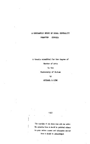 Brampton is a small market town located 9½ miles E.N.E. of Carlisle at the centre of a sub-region referred to as N.E. Cumbria. This position has helped to make it not only an important route centre but also a focus for the surrounding district. The study examines the present role of Brampton as a small rural service centre, the extent of its influence on the surrounding region, and the amount of dependence of that region on the town. Thus a measurement of the degree of centrality is obtained from which a picture of the region’s spatial and behavioural characteristics emerges. In addition, reasons why and how Brampton has developed centrality are also explored. Enquiry into the nature of services within the region and certain behavioural characteristics of a sample of the population was effected by three personally conducted surveys (two by questionnaires). The results have enabled not only the scale and provision of services to be analysed, but also the degree of influence and preference for particular centres to be measured. The same information is also used to test several recognised models of centrality; including adaptations of Reilly's 'gravity model' by D.L. Huff, and the ranking of centres based on functional indices devised by W.K.D. Davies. A further technique has been designed which measures the attractiveness of any settlement covered by the surveys. It involves analysing the journeys made by consumers to a centre, and allotting 'weighting' values based on the degree of difficulty. From the patterns of centrality thus produced, a hierarchy of settlement emerges which is then examined in relation to the classical theories of central place. In conclusion, the study summarises the results of all the analysis and enquiry, and sets the scene for the future development of Brampton in the context of its role as a central place.