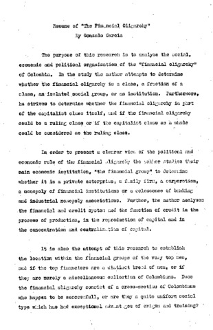 The purpose of this research is to analyse the social, economic and political organization of the “financial oligarchy” of Colombia. In the study the author attempts to determine whether the financial oligarchy is a class, a fraction of a class, an isolated social group, or an institution. Furthermore, he strives to determine whether the financial oligarchy is part of the capitalist class itself, and if the financial oligarchy could be a ruling class or if the capitalist class as a whole could be considered as the ruling class. In order to present a clearer view of the political and economic role of the financial oligarchy the author studies their main economic institution, “the financial group” to determine whether it is a private enterprise, a family firm, a corporation, a monopoly of financial institutions or a colescence of banking and industrial monopoly associations. Further, the author analyses the financial and credit system and the function of credit in the process of production, in the reproduction of capital and in the concentration and centralization of capital. It is also the attempt of this research to establish the location within the financial groups of the very top men, and if the top financiers are a distinct breed of men, or if they are merely a miscellaneous collection of Colombians. Does the financial oligarchy consist of a cross-section of Colombians who happen to be successful, or are they a quite uniform social type which has had exceptional advantages of origin and training? How have they climbed to the top levels of Colombian finance capital? How have they maintained their positions and how does job recruitment take place? Studying the social mobility of the Colombian financial oligarchy the author develops two different types of movements. The first, a vertical movement, is moving from a lower occupational background to a position in the financial oligarchy – movement out of the occupation of the father, through a succession of positions to a position in the financial oligarchy. The second, a horizontal movement, is from a financial background to a position in the financial oligarchy – movement through a series of occupations with the intention of establishing in their own persons the position their father occupied in the financial oligarchy. These two movements give rise to two main groups: “The mobile oligarchy” and “the birth oligarchy”. At the same time, the “mobile financial oligarchy” can be divided into two groups: “The well-born mobile oligarchy” and “the social-climber mobile oligarchy” The “social-climber” moves from an occupational background out of the capitalist class of landowner class to a position in the financial oligarchy. And the “well-born” move from a capitalist (agricultural, commercial and industrial bourgeoisie) or landowner background to a position in the financial oligarchy. The financial capital is controlled by financial groups, which are composed of a linkage of banks, insurance companies, financial corporations, savings and loan corporations, wharehouses, investment trusts, development funds, the central bank and great commercial and industrial enterprises. This linkage is affected by a small number of individuals: top shareholders, chairman of the boards, presidents, vice-presidents, and others, who comprise top management. They may thus be said to preside over a combination of functions and thereby acquire a good measure of control over a slice of capitalism’s sphere of operations. The author demonstrates that the separation of ownership and control in Colombian financial oligarchy does not exist. In the first place, the managers are very often owner; secondly, even when managers are not important shareholders in their own groups, they are usually quite wealthy men; thirdly, they are mutually interested in high profits and profitable expansion; and fourthly, the recruitment of managers and shareholders is predominantly from the upper strata of society. In conclusion, the advent of finance capital has created an oligarchy within the capitalist class itself. The top groupings of finance capital have constituted collectively the top stratum of the capitalist class, and in effect, decide policy, acting not simply with a view of their own particular interests but from their conception of the interests of their class as a whole. The political rule of the finance capital is not a matter of absolute power. It is a matter of pursuing class interests in conditions of class struggle on a national and international scale.