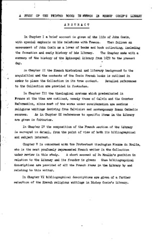 In Chapter I a brief account is given of the life of John Cosin, with special emphasis on his relations with France. Then follows an assessment of John Cosin as a lover of books and book collecting, including the formation and early history of his library. The Chapter ends with a summary of the history of the Episcopal library from 1672 to the present day. In Chapter II the French historical and literary background to the acquisition and the contents of the Cosin French books is outlined in order to place the collection in its true context. Detailed references to the Collection are provided in footnotes. In Chapter III the theological systems which predominated in France at the time are outlined, namely those of Calvin and the Counter Reformation, since most of the works under consideration are serious religious writings deriving from Calvinist and contemporary Roman Catholic sources. As in Chapter II references to specific items in the library are given in footnotes. In Chapter IV the composition of the French section of the library is surveyed in detail, from the point of view of both its bibliographical and subject interest. Chapter V is concerned with the Protestant theologian Pierre du Moulin, who is the most profusely represented French writer in the Collection under review in this study. A short account of Du Moulin’s position in relation to the library and its founder is given: then bibliographical descriptions are provided of all the French items in the library by and relating to this writer. In Chapter VI bibliographical descriptions are given of a further selection of the French religious writings in Bishop Cosin’s Library.