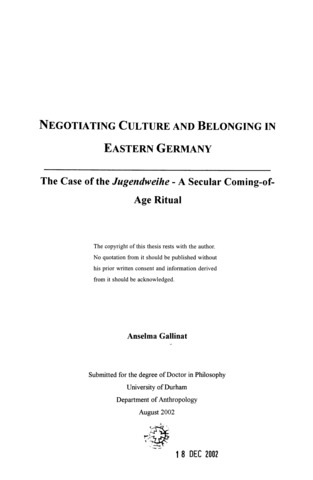 Negotiating culture and belonging in Eastern Germany : the case of the Jugendweihe : a secular coming-of-age ritual.