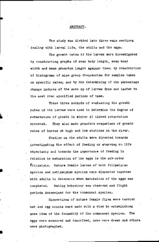 The study was divided into three main sections dealing with larval life, the adults and the eggs. The growth rates of the larvae were investigated by constructing graphs of mean body length, mean head width and mean pronotum length against time; by construction of histograms of size group frequencies for samples taken on specific dates; and by the determining of the percentage change indices of the move up of larvae from one instar to the next over specified periods of time. These three methods of evaluating the growth rates of the larvae were used to determine the degree of retardation of growth in winter if indeed retardation occurred. They also made possible comparison of growth rates of larvae at high and low stations on the river. Studies on the adults were directed towards investigating the effect of feeding or starving on life expectancy and towards the importance of feeding in relation to maturation of the eggs in the sub-order filipalpia. Mature female larvae of both filipalpian species and setipalpian species were dissected together with adults to determine when maturation of the eggs was completed. Mating behaviour was observed and flight periods determined for the commonest species. Dissections of mature female flies were carried out and egg counts were made with a view to establishing some idea of the fecundity of the commonest species. The eggs were measured and described, some were drawn and others were photographed.