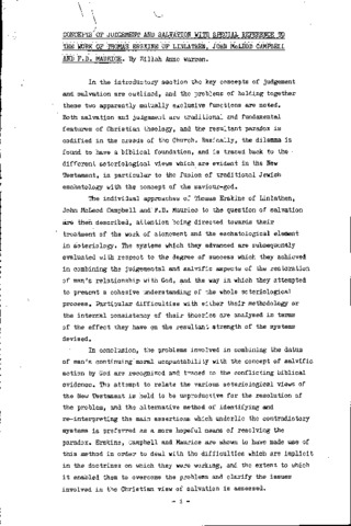 Concepts of judgement and salvation with special reference to the work of Thomas Erskine of Linlathen, John McLeod Campbell, and F. D. Maurice.