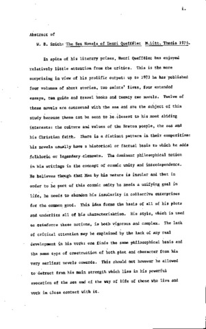 In spite of his literary prizes, Henri Queffélec has enjoyed relatively little attention from the critics. This is the more surprising in view of his prolific output: up to 1973 he has published four volumes of short stories, two saints' lives, four extended essays, ten guide and travel books and twenty two novels. Twelve of these novels are concerned with the sea and are the subject of this study because these can be seen to be closest to his most abiding interests: the culture and values of the Breton people, the sea and his Christian faith. There is a distinct pattern in their composition: his novels usually have a historical or factual basis to which he adds folkloric or legendary elements. The dominant philosophical notion in his writings is the concept of cosmic unity and interdependence. He believes though that Man by his nature is insular and that in order to be part of this cosmic unity he needs a unifying goal in life, he needs to abandon his insularity in collective enterprises for the common good. This idea forms the basis of all of his plots and underlies all of his characterisation. His style, which is used to reinforce these notions, is both vigorous and complex. The lack of critical attention may be explained by the lack of any real development in his work: one finds .the same philosophical basis and the same type of construction of both plot and character from his very earliest novels onwards. This should not however be allowed to detract from his main strength which lies in his powerful evocation of the sea and of the way of life of those who live and work in close contact with it.