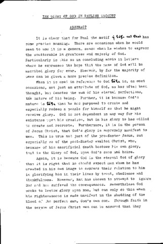 It is clear that for Paul the motif has some precise meaning. There are occasions when he would seem to use it in a general sense when he wishes to express the unutterable in greatness and majesty of God. Particularly is this so in concluding words in letters where he expresses the hope that the name of God will he ascribed glory for ever. However, by far the majority of uses can be given a more precise definition. When it is used in reference to God is, on most occasions, not just an attribute of God, as has often been thought, but denotes the sum of his eternal perfections, the nature of his being. Further, it is because God’s nature is that he has purposed to create and especially redeem a people for himself so that he might receive glory. God is not dependent in any way for his existence upon his creation, but in his glory he has willed to create and recreate. Furthermore, it is in the person of Jesus Christ, that God's glory is supremely manifest to men. This is true not just of the pre-Easter Jesus, but especially so of the post-Easter exalted Christ, who, because of his sacrificial death bestows his own glory, that is the Glory of God, upon God's sons and heirs. Again, it is because God is the eternal God of glory that it is right that he should expect men whom he has created in his own image to express their relation to him in glorifying him in their lives by trust, obedience and thankfulness. However, man has chosen to attempt to ignore God and has suffered the consequences. Nevertheless God seeks to bestow glory upon man, but can only do this when his righteousness is made manifest in the shedding of the blood of the perfect man, God's own son. Through faith in the person of Jesus Christ men can be assured that they receive the glory of God. But is not simply an eschatological idea. While the main thrust of the motif is forward-looking to the day when the glory of God will be revealed and the glorification of believing men will be manifest to all, there is also the present aspect. Just as here and now God declares his people to be his sons, so too does he already bestow upon them his nature of glory, that is, he changes the inward direction of Christians so that they may be transformed from one glory to another in the present age.
