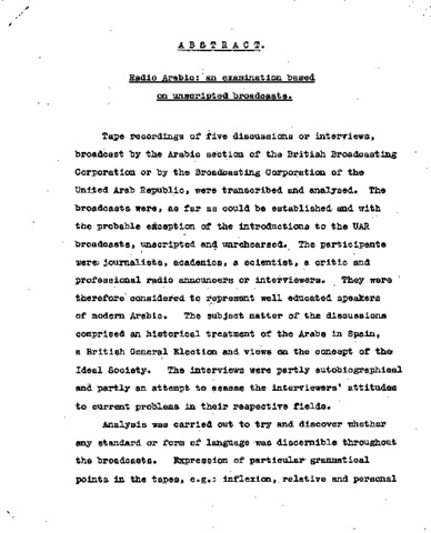 Tape recordings of five discussions or interviews:, broadcast by the Arabic section of the British BroadcastingCorporation or by the Broadcasting Corporation of the United Arab Republic, were transcribed and analysed. The broadcasts were, as far as could be established-and with the probable exception of the introductions to the UAR broadcasts, unscripted and unrehearsed. The participants were; journalists, academics, a scientist, a critic and professional radio announcers or interviewers. They were therefore considered to represent well educated speakers of modern Arabic. The subject matter of the discussions comprised an historical treatment of the Arabs in Spain, a British General Election and views on the concept of the Ideal Society. The interviews were partly autobiographical and partly an attempt to assess the interviewers' attitudesto current problems in their respective fields Analysis was carried out to try and discover whether any standard or form of language was discernible throughout the broadcasts. Expression of particular grammatical points i n the tapes, e.g. inflexion, relative and personal pronouns, the conditional, the negative etc., have been related to their form in the modem literary languages and in some important forms, of colloquial. Analysis of certain points such as forms of address has raised as many questions as it has answered. Pause fillers have been discussed without relation to either the modem literary language Or the colloquial, since standard works make almost no reference to them. The tapes are too restricted in subject matter and length to state any definite conclusions on the nature of radio Arabic. Certain trends; do however seem to be apparent, and these have been, indicated where; possible. In addition some points have been indicated as meriting further examination.