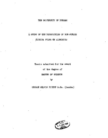 The dissolution behaviour in sulphate solutions of so-called non-porous anodic alumina films and films formed in dry oxygen and i n a moist oxygen atmosphere on chemically polished aluminium has "been investigated. Evidence is presented which indicates that the non-porous anodic films, formed at 7-30 volts, consisted of two regions, a thin, less soluble region adjacent to the metal and a thicker, more soluble outer region into which hydroxyl ions were incorporated. The structure might be related to the initial method of surface preparation adopted. It is suggested that films formed in dry oxygen at 500 C consist of crystalline Y-alumina, whilst those formed in the moist oxygen atmosphere a t 500 C possibly consist of amorphous alumina with someadsorbed water and are less faulted than the crystalline oxide. Again, there is some indication that the structure of these filmsis strongly influenced by the initial method of surface preparation used. The dissolution behaviour of the anodic films and films formed in dry oxygen at 500 C can be understood in terms of the extent of sulphate ion adsorption, apparently greater under the same conditions for the former type, and its effect on rate of transfer of protons, hydroxyl ions and water across the oxide/solution interface. A reaction scheme, proposed earlier to account for the behaviour during dissolution of the barrier layer of porous films formed anodically in sulphuric acid, appears adequate to explain the dissolution behaviour observed in the present studies. However, the type of behaviour, although rather similar for both' anodic non-porous and films formed in dry oxygen at 500 C, was quite different from the barrier layer of porous films formed anodically in sulphuric acid.