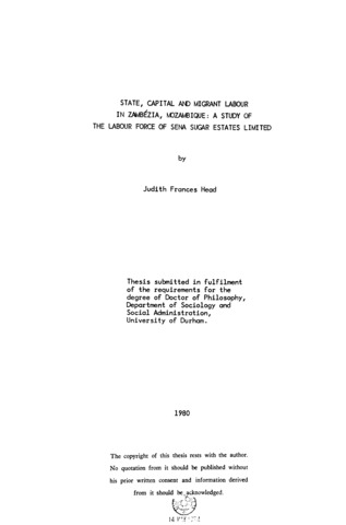 State, capital and migrant labour in Zambezia, Mozambique : a study of the labour force of the Sena Sugar Estates Limited.