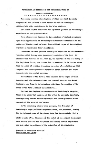 This essay contains nine chapters of which the first is mainly biographical and includes a short account of all the theological, writings laid under contribution in the later chapters. The second chapter deals with the important question of Swedenborg’s experiences of the spiritual world. These chapters are designed to lay a minimum of factual groundwork upon which appreciation of Swedenborg’s distinctive contribution to all matters of theology must be based. Some critical review of the spiritual experiences accompanies their description. Thereafter the work proceeds directly to exposition of the fundamental teachings which impinge upon Swedenborg’s doctrine of the Word. Of necessity his doctrine of God, that is, the doctrine of the sole Deity of the Lord Jesus Christ, the Tri-une God, is examined. It is further shown that the order of creation determines the order of revelation and that "degrees" and "correspondences" afford the means by which the Divine descends into the created universe. The doctrine of the Word is then examined in the light of these teachings and his statements about the internal sense of the Sacred Scriptures are found to be harmonious with them. The question of the canon of the Word is raised and considered, the last two chapters are concerned with Swedenborg’s exegesis. First it is shown that exegesis of the letter is supremely important, distinguishing however between historical and literary criticism and exegesis of the sense of the letter. In the concluding chapter four passages, two from each of Swedenborg’s major published exegetical works, are presented, showing how the internal sense of the chosen texts has been reached. Next a study is made of his treatment of the symbol of the serpent in passages from various parts of the Scriptures and finally certain experiments are made under the guidance of his principles of interpretation.