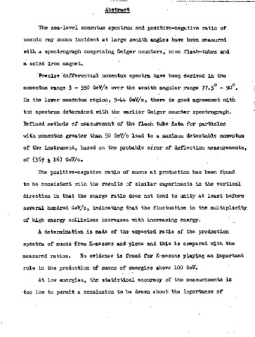 The sea-level momentum spectrum and positive-negative ratio of cosmic ray muons incident at large zenith angles have been measured with a spectrograph comprising Geiger counters, neon flash-tubes and a solid iron magnet. Precise differential momentum spectra have been derived in the momentum range 3 – 550 GeV/c over the zenith angular range 77.5 - 90 . In the lower momentum region, 5-44 GeV/c, there is good agreement with the spectrum determined with the earlier Geiger counter spectrograph. Refined methods of measurement of the flash tube data for particles with momentum greater than 50 GeV/c lead to a maximum detectable momentum of the instrument, based on the probable error of deflection measurements, of (369 ± 16) GeV/c. The positive-negative ratio of muons at production has been found to be consistent with the results of similar experiments in the vertical direction in that the charge ratio does not tend to unity at least before several hundred GeV/c, indicating that the fluctuation in the multiplicity of high energy collisions increases with increasing energy. A determination is made of the expected ratio of the production spectra of muons from K-mesons and pions and this is compared with the measured ratios. No evidence is found for K-mesons playing an important role in the production of muons of energies above 100 GeV. At low energies, the statistical accuracy of the measurements is too low to permit a conclusion to be drawn about the importance of K-meson production; it is found that the muon spectra at low energies are comparatively insensitive to the nature of the parent particles and very high statistical accuracy would be required in order to make an estimate of K-meson production. The measurements have been combined with other data and used to estimate the ratio of production of charged K-mesons to pions in proton-air nucleus collisions and it is found that the upper limit of this ratio falls from O.65 at a proton energy of 10(^3) GeV to 0.2 at 2.10(^4) GeV. It is concluded that there is no evidence for a rapid increase in the K/πratio over a range of primary proton energies extending from a few GeV to some 500,000 Ge(^V) , and that the ratio is probably less than 0.4 over all energy ranges.