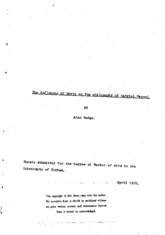 The purpose of this study is to examine the nature of the influence of the philosophy of Josiah Royce (1855-1916) upon me thought of Gabriel Marcel (1889- ). In following the development of Marcel's philosophy it is possible to see how his acquaintance with Royce's philosophy was the intellectual counterpart to the influence on him of his experience as a Red Cross worker during the Great War. Royce's peculiar style of idealism was both the point of contact with Marcel's Idealist background and the source of inspiration for his new philosophical condition. Marcel's main concern was to establish a philosophy of personal relationships which would distinguish personal knowledge from empirical knowledge. He achieved this in his notion of inter subjectivity, with its distinction between I-it relationships and the I-thou encounters. The latter are the realm of all personal values such as fidelity, love and hope. From an analysis of Marcel's study of Royce, made during the Great War, one can see how Marcel was impressed by Royce, particularly by his theory of interpretation. From a survey of both Marcel's notion of inter subjectivity and Royce's theory of interpretation common alms and Interests are clearly seen. But the main Influence of Royce's Work stems from Royce's theory of triadic relations, which made it possible for Marcel to reinstate the central Importance of personal values.