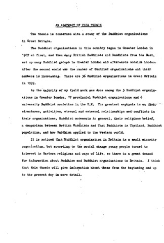 The thesis is concerned with a study of the Buddhist organizations in Great Britain. The Buddhist organizations in this country began in Greater London in 1907 at first, and then many British Buddhists and Buddhists from the East set up many Buddhist groups in Greater London and afterwards outside London. After the Second World War the number of Buddhist organizations and their members is increasing. There are 36 Buddhist organizations in Great Britain in 1972. As the majority of my field work was done among the 5 Buddhist organizations in Greater London, 17 provincial Buddhist organizations and 6 university Buddhist societies in the U.K. The greatest emphasis is on their structures, activities, eternal and external relationships and conflicts in their organizations, Buddhist movements in general, their religious belief, a comparison between British Buddhists and Thai Buddhists in Thailand, Buddhist population, and how Buddhism applied to the Western world. It is noticed that Buddhist organization in Britain is a small minority organization, but according to the social change young people turned to interest in Eastern religions and ways of life, so there is a great demand for information about Buddhism and Buddhist organizations in Britain. I think that this thesis will give information about these from the beginning and up to the present day in more detail.