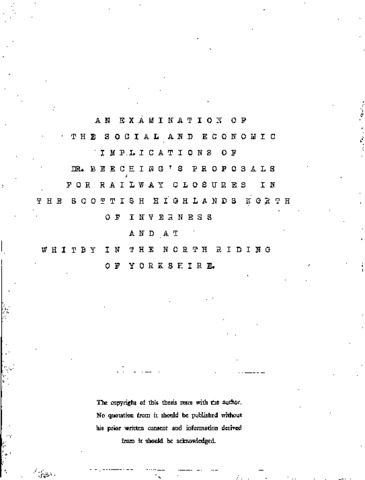 An examination of the social and economic implications of Dr. Beeching’s proposals for railway closures in the Scottish highlands North of Inverness and at Whitby in the North riding of Yorkshire.