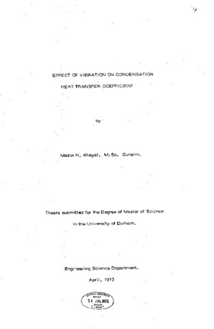 The project deals with an investigation into the effect of vibration on condensation heat transfer. Saturated steam was condensed on a horizontal stainless steel tube which was transversely vibrated in the plane of the gravitational field. The work involved the design, instrumentation and development of a test condenser which employed a reciprocating mode of vibration and was capable of operating at different amplitudes and frequencies. An electric method employing a constant current to measure the condenser tube temperature was explained. The experimental results showed improvements in the heat transfer coefficient with vibration, over its value with no vibration. Empirical correlation of the experimental data under vibrational conditions was established. Results for the static condenser tests were correlated with Nusselts classical theory of condensation. Visual observations of the condensate orientation and drainage under vibrational conditions was reported.