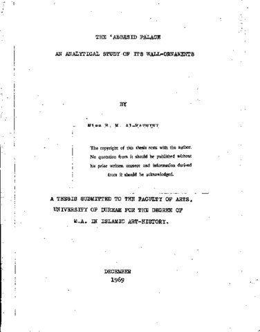 Most researchers differ in their attitude towards the building inside Baghdad Citadel which used to be called “al-Ma’mun Palace”. Some scholars have given it the name “Abbasid Palace” implying that it was where a Caliph used to live. No ancient historical books mention Palace, or discuss it from the artistic point of view. The first chapter gives a general historical survey, to throw light on some of the buildings periods which preceded the construction of the ‘Abbasid Palace. In the second chapter a description is given of the plan of the building itself, which is compared with similar plans of other buildings in Islamic countries. In this chapter is also given a description of the ornament called muqarnasat (which used to be called stalactite). A comparison is made between this ornament in the Palace with that in other contemporary buildings. In the third chapter analytical studies are offered of the wall ornaments; discussing in detail the most important elements of design used in ornament throughout Islamic art and architecture; the particular connexions between those in the Abbasid Palace and in the other contemporary buildings are elucidated, as well as the history of the elements themselves in the Islamic and pre-Islamic world. The conclusion demonstrates both the period of the erection of the Abbasid Palace and the purpose it was designed to serve.