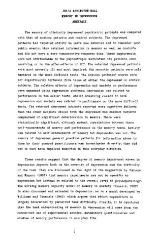 The memory of clinically depressed psychiatric patients was compared with that of anxious patients and control subjects. The depressed patients had impaired ability to learn new material and to remember past public events; they retained information in memory as well as controls and did not have a more conservative response bias. These impairments were not attributable to the psychotropic medication the patients were receiving or to the after-effects of ECT. The retarded depressed patients were most severely ill and most impaired; the neurotic patients were only impaired on the more difficult tests. The anxious patients' scores were not significantly different from those of either the depressed or control subjects. The relative effects of depression and anxiety on performance were assessed using regression analysis; depression was related to performance on the easier tests, whilst something common to both depression and anxiety was related to performance on the more difficult tests. The retarded depressed subjects reported more cognitive failures than the other subjects whilst both the depressed and anxious subjects complained of significant deterioration in memory. There were statistically significant, although modest, correlations between these self-assessments of memory and performance on the memory tests. Anxiety was related to self-assessments of memory but depression was not. The memory of depressed general practice patients for information given to them by their general practitioners was investigated directly; they did not in fact have impaired memories in this everyday situation. These results suggest that the degree of memory impairment shown in depression depends both on the severity of depression and the difficulty of the task. They are discussed In the light of the suggestion by Johnson and Magaro (1987) that memory Impairments may not be specific to depression but instead be related to the overall level of psychopathology. The working memory capacity model of memory in anxiety (Eysenck, 1982) is also discussed and extended to depression, as is a model developed by Williams and Teasdale (1982) which argues that effort expenditure is largely determined by perceived task difficulty. Finally, it is concluded that the best understanding of memory in depression will come from the concurrent use of experimental studies, metamemory questionnaires and studies of memory performance in everyday life.