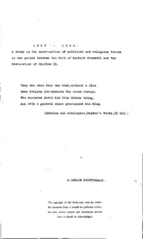1659 - 1660: A study in the inter-action of political and religious forces in the period between the fall of Richard Cromwell and the restoration of Charles II.