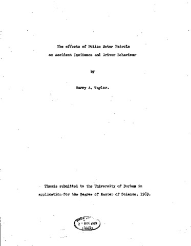 This work gives an account of an experiment conducted by Durham University on behalf of The Research and Development Branch of The Home Office. The object of the experiment was to establish the effect, if any, of various levels of Police Motor Patrol on the accident rate. The project was confined to Trunk Roads Al and AI9, within the Durham Constabulary area and lasted from August 1967, to September 1968. The two roads were divided to provide four motor patrol routes each approximately twelve miles long. Two of the routes were kept as Controls throughout the project. The other two were subjected to varying Police patrol levels and different tactics. The time element was divided into four phases, each approximately of three months duration. Phase 1 was used to obtain control data for all four routes. During Phase 2 the patrol level on route 2 was increased by two patrol cars. In Phase 3 an additional seven motor cycles were used on route 4. During Phase 4 four motor cycles were alternated in cycles of ten days between routes 2 and 4.Throughout the experiment measurements were made of patrol hours reported, accidents and other incidents dealt with on route. The statistical analysis of the measurements is fully reported and the measurements, are presented in tabular and graph form. During the project surveys were made of the distribution of patrols crews time between various tasks and the function of single and double ere wed patrol cars. Studies were made of certain Police administrative procedures and completely new systems of accident and process reporting were introduced. A series .of pilot experiments were conducted establishing the effect of Police Patrols on driver behaviour. These pilot experiments were used as a basis for. a. further experiment.