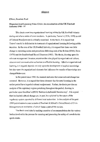 Organisational learning from crisis : an examination of the UK football industry 1946-97.
