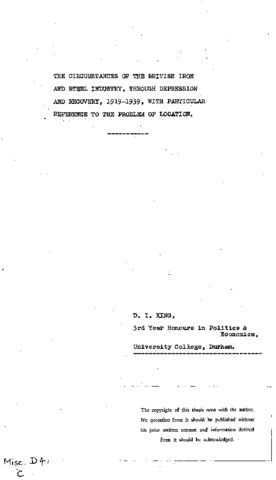 The circumstances of the British iron and steel industry, through depression and recovery, 1919 – 1939, with particular reference to the problem of location.