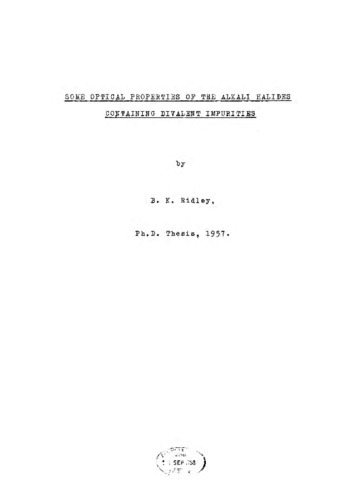 The investigation was limited mainly to NaCl.Mn++ and NaCl.Ca++, and was concerned with colour centres in single crystals of these materials. The crystals were grown by the Kyropoulis technique and optical absorption measurements were made with a grating spectrophotometer. The emphasis of the work was placed on the production of Z-bands in NaCl. Ca++ but the effects of optical and thermal bleaching and of quenching were investigated in all crystals. The results of the work on NaCl.Mn++ confirmed the model of Schneider and Caffyn (1955) in which the Mn++ ions and positive ion vacancies are deposited at dislocations and become more uniformly distributed after quenching. In particular, it was found that quenched crystals were luminescent after being X-rayed, indicating the presence of dispersed Mn++ ions; a similar result was found in NaCl .Ni++. A short study of the distribution of Mn++ in crystals was also made. It was found that Mn++ and Ni++ gave rise tocharacteristic bands in the ultra violet, a weakband at 275 Mµ with Mn++, a strong band at 247 mµ with Ni++. The presence of a band at 255 mµ in NaCl.Cu++ was confirmed. No evidence was obtained for the formation of Z-bands by Mn++, Ni++ or Cu++. Calcium was found to be much more soluble in NaCl than manganese, and enhanced the colourability proportionately less, pointing to a close relationship between solubility, mis-match, and the production of negative ion vacancies. Analysis of the F-band in coloured NaC1.Ca++ crystals indicated that Z- centres were formed by X-rays. Quenching enhanced the number of Z-centres, indicating a deposition at dislocations similar to that found for manganese. Evidence for the formation of both Z(_1)- and Z(_2)- centres by X-irradiation was found. In crystals containing a high proportion of Ca++ a band at 345 mp, which is probably to be associated with Ca++- positive ion vacancy complexes, was prominent. The results of an investigation of the effect of concentration of Ca++ on the growth of the F- and Z-bands indicated that a Ca++ ion introduced about ten negative ion vacancies into the crystal. On the basis of a statistical mechanical model of the formation of Z-centres it was inferred that of the Ca++ ions producing Z-centres no more than 2% were associated with positive ion vacancies, confirming the work of Etzel (l952). It was also inferred that the activation energy associated with the liberation of Ca++ ions from dislocations to form incipient Z-centres was 1.9 eV, a value which agreed well with an estimated value. Factors influencing the width of the F-band are also discussed.