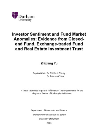 The investor sentiment hypothesis has become a promising avenue by way of a behavioural approach to complementing conventional explanations of financial market anomalies. In response to the problems exhibited in the existing theories, the investor sentiment hypothesis has been widely tested and the results of which turn out to be able to successfully explain the market anomalies to a great extent. The thesis applies the investor sentiment theory to analysing the fund anomalies in both the UK and US markets. The test results and their interpretations may help promote a better understanding of the investor sentiment and its impacts including their geographical differences. We contribute to the literature by focusing on the sentiment measures, among others. Since the investor sentiment reflects the investors’ behaviour and psychology, it is hard to be properly captured. We have constructed the proxies for the sentiment factor in both direct and indirect forms. The first fund anomaly we analysed is the “closed-end fund puzzle”. The puzzle is so-called because at IPO, the fund is issued at a premium to the net asset value (NAV); however, thispremium disappears in the next few months. The fund then trades at a discount. This discount is not fixed, varying substantially during the closure period. When the closed-end fund is either converted into an open-end fund or liquidated, the discount shrinks and the share price will rise. We construct an out-of-sample test by using the two-factor and five-factor models. The results show that the investor sentiment can contribute to explaining closed-end fund discounts in the UK market and it is more prevalent in smaller size portfolios. We also find the evidence to support investor sentiment as an important factor to represent systematic risk in the return generating process. Next, we examine the price deviations of Exchange Traded Funds (ETFs). Unlike closed end funds whose prices also deviate from the NAV, ETFs, through a mechanism known as redemption in-kind, allow institutional investors to potentially earn a profit by arbitraging away these price deviations through creating and deleting outstanding shares of the ETF. Hence, we are motivated to identify the factors that may impact on the determination of these premiums and discounts to the NAV. We first construct a sentiment proxy from the derivative market variables such as the option put–call trading volume ratio and the open interest ratio. Then we develop a sentiment proxy based on the consumer confidence index, obtained from the mainstream consumer surveys and this proxy is taken to the individual fund level. The results provide evidence that this sentiment proxy has explanatory power for most individual ETF mispricing. We take the whole industry into account and find that the sentiment factor has incremental explanatory power and is positively related to the fund premium. The evidence also shows that more sentiment-sensitive ETFs are those that have smaller, younger and volatile stocks with low dividend yields. Finally, the thesis considers the fund anomaly in the form of the REIT price momentum. In order to investigate the momentum profitability, we classify the formation period into two sentiment states, i.e. the optimistic and pessimistic periods. Evidence indicates that when sentiment is high, the REIT momentum profitability is substantial and significant; however, when the sentiment is low, the profits from the REIT momentum are much lower and not significant. We also examine the interplay between REIT liquidity and momentum profitability. We find that high REIT liquidity portfolios generate higher momentum returns, but this is only significant when the sentiment is optimistic. Furthermore, consistent with our previous findings, our evidence that momentum is generally larger for smaller companies confirms that the size effect is still available in the REIT industry. This is because the smaller companies are often difficult to value, as they are more prone to subjective evaluations. The sentiment thus could be more significant in small size companies.