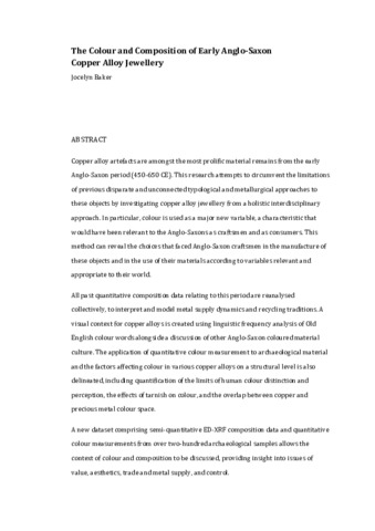 Copper alloy artefacts are amongst the most prolific material remains from the early Anglo-Saxon period (450-650 CE). This research attempts to circumvent the limitations of previous disparate and unconnected typological and metallurgical approaches to these objects by investigating copper alloy jewellery from a holistic interdisciplinary approach. In particular, colour is used as a major new variable, a characteristic that would have been relevant to the Anglo-Saxons as craftsmen and as consumers. This method can reveal the choices that faced Anglo-Saxon craftsmen in the manufacture of these objects and in the use of their materials according to variables relevant and appropriate to their world. All past quantitative composition data relating to this period are reanalysed collectively, to interpret and model metal supply dynamics and recycling traditions. A visual context for copper alloys is created using linguistic frequency analysis of Old English colour words alongside a discussion of other Anglo-Saxon coloured material culture. The application of quantitative colour measurement to archaeological material and the factors affecting colour in various copper alloys on a structural level is also delineated, including quantification of the limits of human colour distinction and perception, the effects of tarnish on colour, and the overlap between copper and precious metal colour space. A new dataset comprising semi-quantitative ED-XRF composition data and quantitative colour measurements from over two-hundred archaeological samples allows the context of colour and composition to be discussed, providing insight into issues of value, aesthetics, trade and metal supply, and control.