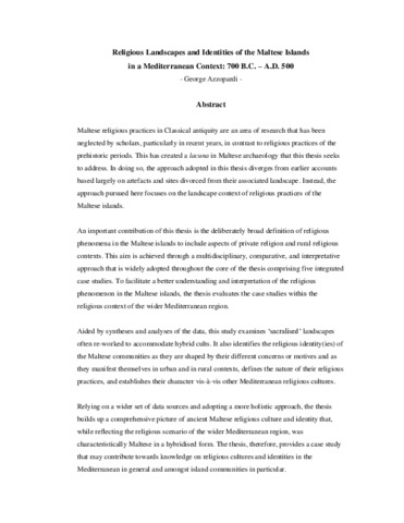 Religious Landscapes and Identities of the Maltese Islands in a Mediterranean Context: 700 B.C. - A.D. 500