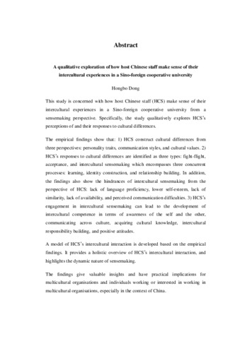 This study is concerned with how host Chinese staff (HCS) make sense of their intercultural experiences in a Sino-foreign cooperative university from a sensemaking perspective. Specifically, the study qualitatively explores HCS’s perceptions of and their responses to cultural differences. The empirical findings show that: 1) HCS construct cultural differences from three perspectives: personality traits, communication styles, and cultural values. 2) HCS’s responses to cultural differences are identified as three types: fight-flight, acceptance, and intercultural sensemaking which encompasses three concurrent processes: learning, identity construction, and relationship building. In addition, the findings also show the hindrances of intercultural sensemaking from the perspective of HCS: lack of language proficiency, lower self-esteem, lack of similarity, lack of availability, and perceived communication difficulties. 3) HCS’s engagement in intercultural sensemaking can lead to the development of intercultural competence in terms of awareness of the self and the other, communicating across culture, acquiring cultural knowledge, intercultural responsibility building, and positive attitudes. A model of HCS’s intercultural interaction is developed based on the empirical findings. It provides a holistic overview of HCS’s intercultural interaction, and highlights the dynamic nature of sensemaking. The findings give valuable insights and have practical implications for multicultural organisations and individuals working or interested in working in multicultural organisations, especially in the context of China.