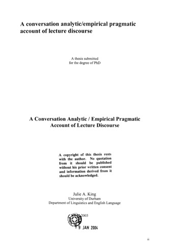 A conversation analytic/empirical pragmatic account of lecture discourse.