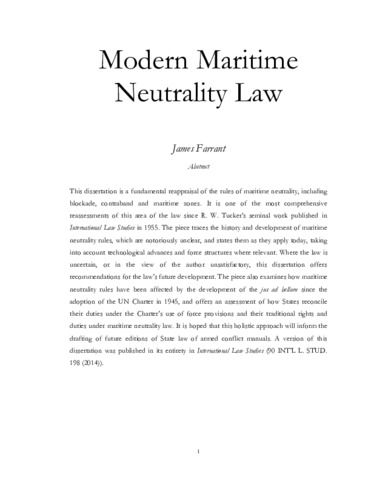 This dissertation is a fundamental reappraisal of the rules of maritime neutrality, including blockade, contraband and maritime zones. It is one of the most comprehensive reassessments of this area of the law since R. W. Tucker's seminal work published in International Law Studies in 1955. The piece traces the history and development of maritime neutrality rules, which are notoriously unclear, and states them as they apply today, taking into account technological advances and force structures where relevant. Where the law is uncertain, or in the view of the author unsatisfactory, this dissertation offers recommendations for the law’s future development. The piece also examines how maritime neutrality rules have been affected by the development of the jus ad bellum since the adoption of the UN Charter in 1945, and offers an assessment of how States reconcile their duties under the Charter’s use of force provisions and their traditional rights and duties under maritime neutrality law. It is hoped that this holistic approach will inform the drafting of future editions of State law of armed conflict manuals. A version of this dissertation was published in its entirety in International Law Studies (90 INT’L L. STUD. 198 (2014)).
