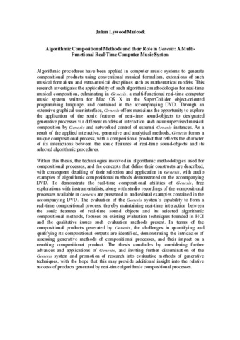 Algorithmic procedures have been applied in computer music systems to generate compositional products using conventional musical formalism, extensions of such musical formalism and extra-musical disciplines such as mathematical models. This research investigates the applicability of such algorithmic methodologies for real-time musical composition, culminating in Genesis, a multi-functional real-time computer music system written for Mac OS X in the SuperCollider object-oriented programming language, and contained in the accompanying DVD. Through an extensive graphical user interface, Genesis offers musicians the opportunity to explore the application of the sonic features of real-time sound-objects to designated generative processes via different models of interaction such as unsupervised musical composition by Genesis and networked control of external Genesis instances. As a result of the applied interactive, generative and analytical methods, Genesis forms a unique compositional process, with a compositional product that reflects the character of its interactions between the sonic features of real-time sound-objects and its selected algorithmic procedures. Within this thesis, the technologies involved in algorithmic methodologies used for compositional processes, and the concepts that define their constructs are described, with consequent detailing of their selection and application in Genesis, with audio examples of algorithmic compositional methods demonstrated on the accompanying DVD. To demonstrate the real-time compositional abilities of Genesis, free explorations with instrumentalists, along with studio recordings of the compositional processes available in Genesis are presented in audiovisual examples contained in the accompanying DVD. The evaluation of the Genesis system’s capability to form a real-time compositional process, thereby maintaining real-time interaction between the sonic features of real-time sound objects and its selected algorithmic compositional methods, focuses on existing evaluation techniques founded in HCI and the qualitative issues such evaluation methods present. In terms of the compositional products generated by Genesis, the challenges in quantifying and qualifying its compositional outputs are identified, demonstrating the intricacies of assessing generative methods of compositional processes, and their impact on a resulting compositional product. The thesis concludes by considering further advances and applications of Genesis, and inviting further dissemination of the Genesis system and promotion of research into evaluative methods of generative techniques, with the hope that this may provide additional insight into the relative success of products generated by real-time algorithmic compositional processes.