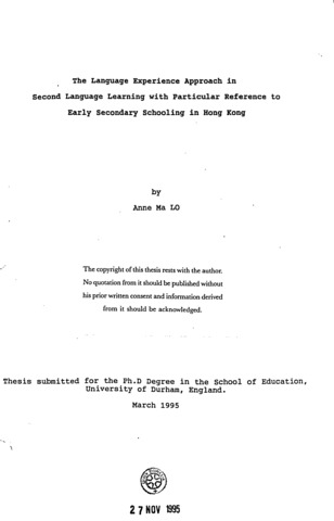 The language experience approach in second language learning with particular reference to early secondary schooling in Hong Kong.