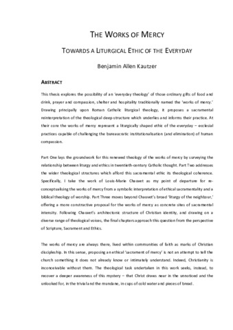 This thesis explores the possibility of an ‘everyday theology’ of those ordinary gifts of food and drink, prayer and compassion, shelter and hospitality traditionally named the ‘works of mercy.’ Drawing principally upon Roman Catholic liturgical theology, it proposes a sacramental reinterpretation of the theological deep-structure which underlies and informs their practice. At their core the works of mercy represent a liturgically shaped ethic of the everyday – ecclesial practices capable of challenging the bureaucratic institutionalisation (and elimination) of human compassion. Part One lays the groundwork for this renewed theology of the works of mercy by surveying the relationship between liturgy and ethics in twentieth-century Catholic thought. Part Two addresses the wider theological structures which afford this sacramental ethic its theological coherence. Specifically, I take the work of Louis-Marie Chauvet as my point of departure for re-conceptualising the works of mercy from a symbolic interpretation of ethical sacramentality and a biblical theology of worship. Part Three moves beyond Chauvet’s broad ‘liturgy of the neighbour,’ offering a more constructive proposal for the works of mercy as concrete sites of sacramental intensity. Following Chauvet’s architectonic structure of Christian identity, and drawing on a diverse range of theological voices, the final chapters approach this question from the perspective of Scripture, Sacrament and Ethics. The works of mercy are always there, lived within communities of faith as marks of Christian discipleship. In this sense, proposing an ethical ‘sacrament of mercy’ is not an attempt to tell the church something it does not already know or intimately understand. Indeed, Christianity is inconceivable without them. The theological task undertaken in this work seeks, instead, to recover a deeper awareness of this mystery – that Christ draws near in the unnoticed and the unlooked for, in the trivial and the mundane, in cups of cold water and pieces of bread.