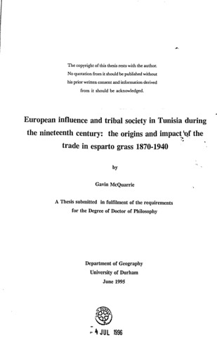 European influence and tribal society in Tunisia during the nineteenth century : the origins and impact of the trade in esparto grass 1870-1940.