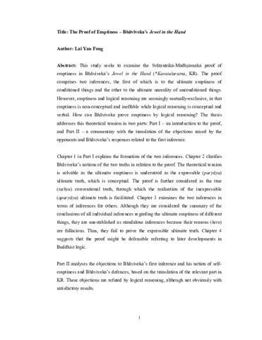 This study seeks to examine the Svātantrika-Madhyamaka proof of emptiness in Bhāviveka’s Jewel in the Hand (*Karatalaratna, KR). The proof comprises two inferences, the first of which is to the ultimate emptiness of conditioned things and the other to the ultimate unreality of unconditioned things. However, emptiness and logical reasoning are seemingly mutually-exclusive, in that emptiness is non-conceptual and ineffable while logical reasoning is conceptual and verbal. How can Bhāviveka prove emptiness by logical reasoning? The thesis addresses this theoretical tension in two parts: Part I – an introduction to the proof, and Part II – a commentary with the translation of the objections raised by the opponents and Bhāviveka’s responses related to the first inference. Chapter 1 in Part I explains the formation of the two inferences. Chapter 2 clarifies Bhāviveka’s notions of the two truths in relation to the proof. The theoretical tension is solvable as the ultimate emptiness is understood as the expressible (paryāya) ultimate truth, which is conceptual. The proof is further considered as the true (tathya) conventional truth, through which the realisation of the inexpressible (aparyāya) ultimate truth is facilitated. Chapter 3 examines the two inferences in terms of inferences for others. Although they are considered the summary of the conclusions of all individual inferences regarding the ultimate emptiness of different things, they are unestablished as standalone inferences because their reasons (hetu) are fallacious. Thus, they fail to prove the expressible ultimate truth. Chapter 4 suggests that the proof might be defensible referring to later developments in Buddhist logic. Part II analyses the objections to Bhāviveka’s first inference and his notion of self-emptiness and Bhāviveka’s defences, based on the translation of the relevant part in KR. These objections are refuted by logical reasoning, although not obviously with satisfactory results.