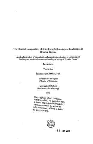 The element composition of soils from archaeological landscapes in Boeotia, Greece : a critical evaluation of element soil analysis in the investigation landscapes co-ordinated with the archaeological survey of Boeotia, Greece.