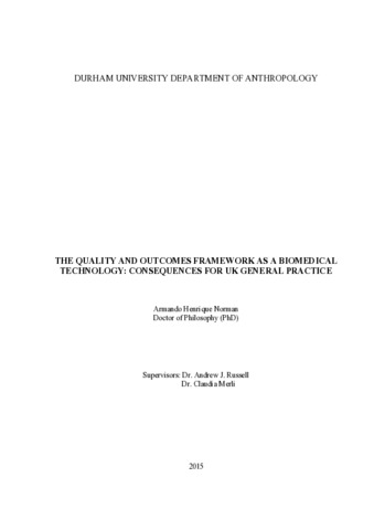 In April 2014 the Quality and Outcomes Framework (QOF), the largest pay-for-performance scheme in primary care in the world, completed 10 years of existence. During this period, medical anthropologists have given little attention to QOF as a biomedical technological innovation for improving quality in general practice. This thesis contributes to the study of biomedical technology in medical anthropology by exploring two questions. First, what QOF in itself entails, its main characteristics and boundaries? Second, what are its consequences for general practice and for professional staff? An ethnographic study was set up to explore the QOF 2013/14 contract year in two general practices in the UK, coupled with participant-observation in a GP training programme. The main findings can be summarised as follows: (1) based on Foucault’s concept of governmentality, QOF as a biomedical technology represents a biopower dispositif for controlling individual (anatomopolitics) and population (biopolitics) by instilling a self-monitoring professional working environment for securing compliance; (2) the QOF clinical fragmentary model based on monetary incentives has literally commodified health professional-patient relationships through an exchange of token-information predicated on patients’ bodily parts. In this quality scheme, commercial ethics tend to predominate over professionals’ ethics; (3) the QOF scheme has produced a series of behaviour ranging from organising the practice team in accordance to QOF’s rules (the ‘QOF game’) to ‘gamesmanship’ with regards to them. The latter is more common as the practice reaches the end of financial year. These behaviours have implications for quality data production, affecting research on QOF, since most of it depends on secondary data sources; (4) in following the QOF depression indicators as a ‘mediating category’ since their inception in 2006/07, the question of ‘quality’ indicator construction and data production is further highlighted. QOF as a biomanagerial technology exemplifies an important cultural change in the UK general practice since compliance with externally dictated policy and its associated technologies changes principles and behaviour, with little scope for a holistic practice.