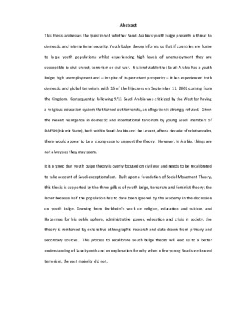 This thesis addresses the question of whether Saudi Arabia’s youth bulge presents a threat to domestic and international security. Youth bulge theory informs us that if countries are home to large youth populations whilst experiencing high levels of unemployment they are susceptible to civil unrest, terrorism or civil war. It is irrefutable that Saudi Arabia has a youth bulge, high unemployment and -- in spite of its perceived prosperity -- it has experienced both domestic and global terrorism, with 15 of the hijackers on September 11, 2001 coming from the Kingdom. Consequently, following 9/11 Saudi Arabia was criticized by the West for having a religious education system that turned out terrorists, an allegation it strongly refuted. Given the recent resurgence in domestic and international terrorism by young Saudi members of DAESH (Islamic State), both within Saudi Arabia and the Levant, after a decade of relative calm, there would appear to be a strong case to support the theory. However, in Arabia, things are not always as they may seem. It is argued that youth bulge theory is overly focused on civil war and needs to be recalibrated to take account of Saudi exceptionalism. Built upon a foundation of Social Movement Theory, this thesis is supported by the three pillars of youth bulge, terrorism and feminist theory; the latter because half the population has to date been ignored by the academy in the discussion on youth bulge. Drawing from Durkheim’s work on religion, education and suicide, and Habermas for his public sphere, administrative power, education and crisis in society, the theory is reinforced by exhaustive ethnographic research and data drawn from primary and secondary sources. This process to recalibrate youth bulge theory will lead us to a better understanding of Saudi youth and an explanation for why when a few young Saudis embraced terrorism, the vast majority did not.