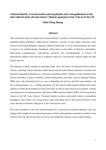 | Uncontrolled Keywords | National identity, study-abroad, cosmopolitanism, identity negotiation, Taiwanese |