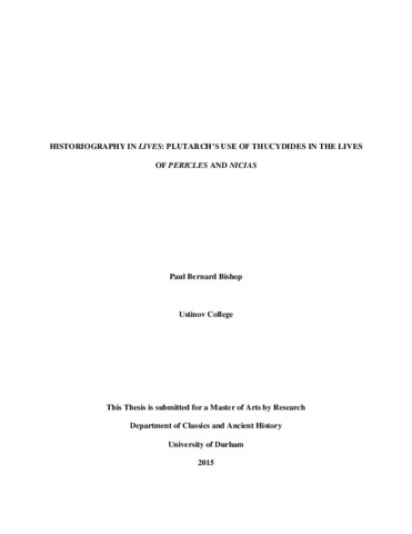 This dissertation argues that Plutarch’s biographical method falls within the realm of historiography, offering Plutarch’s handling of Thucydides’ History as a source for the Pericles and Nicias as test cases. The first chapter discusses the relationship between historiography and biography. History was among the influences in biographical literature’s development into a genre of its own. The genre of biography had the capacity for critical inquiry into what the individual in focus was truly like. The chapter also explores their similarities in methodology and purpose, and argues that historiography is broad enough to include biographical models of interpretation. The next chapter establishes Plutarch’s philosophical framework, examining what theories would influence his interpretation of the historical record. While taking Plutarch’s statements of separation between history and biography seriously, we can still see that his methods of interpretation are not substantially different from historiography, and he displays a rigorous critical inquiry in the Lives. The third and fourth chapters examine Plutarch’s engagement with Thucydides for the Pericles and Nicias. Where Plutarch quotes Thucydides, he preserves the main facts yet uses vocabulary and style of his own. We place particular focus, however, on Plutarch’s divergences from Thucydides, and theorize that these differences are due to Plutarch’s own historical reasoning about what happened. We argue ways in which Plutarch was making inferences and deductions from the text before him based upon his philosophical paradigms and broader knowledge of the history. Plutarch also makes deductions based upon his theory of character types, especially evident in the Nicias. His judgment of the character of every individual is formed by the historical record, and he makes further predictions of what individuals did or felt where the source is silent, drawing from his philosophical understanding of character.