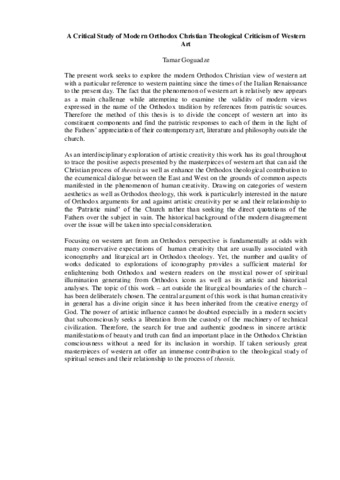 The present work seeks to explore the modern Orthodox Christian view of western art with a particular reference to western painting since the times of the Italian Renaissance to the present day. The fact that the phenomenon of western art is relatively new appears as a main challenge while attempting to examine the validity of modern views expressed in the name of the Orthodox tradition by references from patristic sources. Therefore the method of this thesis is to divide the concept of western art into its constituent components and find the patristic responses to each of them in the light of the Fathers’ appreciation of their contemporary art, literature and philosophy outside the church. As an interdisciplinary exploration of artistic creativity this work has its goal throughout to trace the positive aspects presented by the masterpieces of western art that can aid the Christian process of theosis as well as enhance the Orthodox theological contribution to the ecumenical dialogue between the East and West on the grounds of common aspects manifested in the phenomenon of human creativity. Drawing on categories of western aesthetics as well as Orthodox theology, this work is particularly interested in the nature of Orthodox arguments for and against artistic creativity per se and their relationship to the ‘Patristic mind’ of the Church rather than seeking the direct quotations of the Fathers over the subject in vain. The historical background of the modern disagreement over the issue will be taken into special consideration. Focusing on western art from an Orthodox perspective is fundamentally at odds with many conservative expectations of human creativity that are usually associated with iconography and liturgical art in Orthodox theology. Yet, the number and quality of works dedicated to explorations of iconography provides a sufficient material for enlightening both Orthodox and western readers on the mystical power of spiritual illumination generating from Orthodox icons as well as its artistic and historical analyses. The topic of this work – art outside the liturgical boundaries of the church –has been deliberately chosen. The central argument of this work is that human creativity in general has a divine origin since it has been inherited from the creative energy of God. The power of artistic influence cannot be doubted especially in a modern society that subconsciously seeks a liberation from the custody of the machinery of technical civilization. Therefore, the search for true and authentic goodness in sincere artistic manifestations of beauty and truth can find an important place in the Orthodox Christian consciousness without a need for its inclusion in worship. If taken seriously great masterpieces of western art offer an immense contribution to the theological study of spiritual senses and their relationship to the process of theosis.