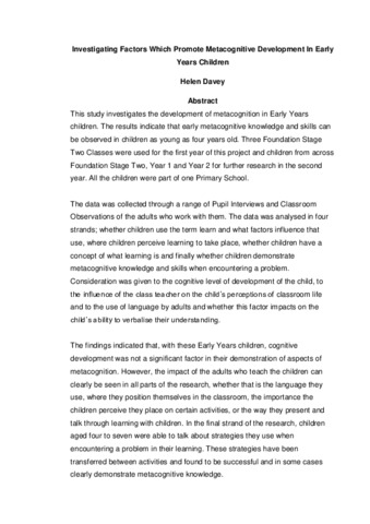 Investigating Factors Which Promote Metacognitive Development in Early Years Children