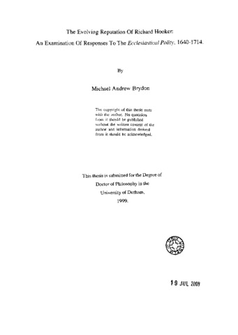 The evolving reputation of Richard Hooker : an examination of responses to the Ecclesiastical Polity, 1640-1714.
