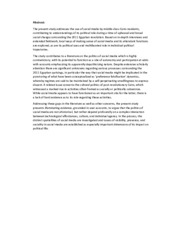 The present study addresses the use of social media by middle-class Cairo residents, contributing to understandings of its political role during a time of upheaval and broad social change surrounding the 2011 Egyptian revolution. Based on in-depth interviews and extended fieldwork, local ways of making sense of social media and its attendant functions are explored, as are its political uses and multifaceted role in individual political trajectories. The study contributes to a literature on the politics of social media which is highly contradictory, with its potential to function as a site of autonomy and participation at odds with accounts emphasizing its apparently depoliticizing nature. Despite extensive scholarly attention there are significant unknowns regarding various processes surrounding the 2011 Egyptian uprisings, in particular the way that social media might be implicated in the puncturing of what have been conceptualized as ‘preference falsification’ dynamics, whereby regimes are said to be maintained by a self-perpetuating unwillingness to express dissent. A related issue concerns the cultural politics of post-revolutionary Cairo, which witnessed a marked rise in activities often framed as socially or politically subversive. While social media appears to have functioned as an important site for the latter, there is a lack of hard evidence as to its role regarding these activities. Addressing these gaps in the literature as well as other concerns, the present study presents illuminating evidence, grounded in user accounts, to argue that the politics of social media are not ahistorical, but rather depend profoundly on a complex interaction between technological affordances, culture, and individual agency. In the process, the distinct spatialities of social media are investigated and issues of visibility, presence, and sociality in social media are established as especially important dimensions of its impact on political life.