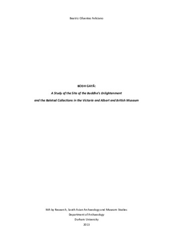 ‘BODH GAYĀ: A Study of the Site of the Buddha’s Enlightenment and the Related Collections in the Victoria and Albert and British Museum’ Beatriz Cifuentes Feliciano Bodh Gayā is recognised as the place of the Buddha’s Enlightenment and has been a site of religious activity for the last 2,300 years. There are significant architectural, sculptural and archaeological remains from this entire time span. The contention of this dissertation is that key elements of the Mahābodhi complex and key finds collected from the location have been left unstudied, leading to confused and partial conclusions about the site’s history. Erroneous conclusions in relation to the Bodhi Tree, the temple’s erection and the nature of mediaeval pilgrimage routes round Bodh Gayā are contested in the thesis through re-examination of the literature available, a focused study of the archaeological and sculptural collections in London (British Museum and V&A) and a thorough analysis of unpublished photographic material from the Cunningham collection. The latter, largely unstudied, provides new information about the state of the site in the 19th century. Collectively, these materials shed light on the development of the Mahābodhi over the centuries and help assess the impact of the restoration works carried out by the Burmese and the British. The British interventions effectively saw Bodh Gayā regain its position as an important centre of modern Buddhism. Numerous assumptions about the temple’s history were translated into its architecture and written into the scholarly literature in ways that have subsequently inspired the available writing on Bodh Gayā. This thesis aims to provide a critical revision of the Mahābodhi’s history through the careful study of the materials available.